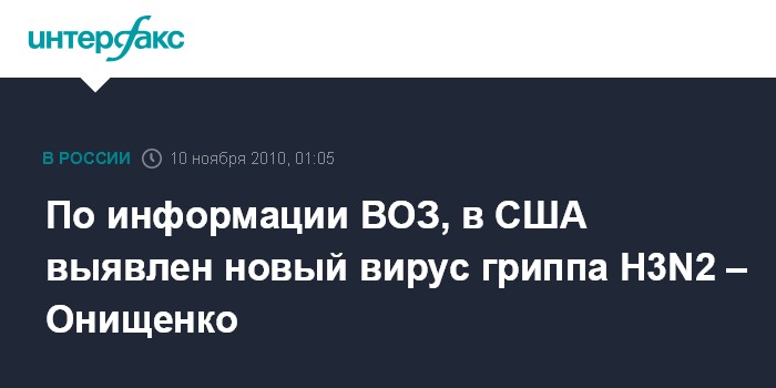 "Мы получили сообщение - настораживающую информацию по системе оповещения Всемирной организации здравоохранения - о том, что в США у двух человек выделен вирус H3N2", - сказал "Интерфаксу" глава Роспотребнадзора, главный государственный санитарный врач РФ Геннадий Онищенко.