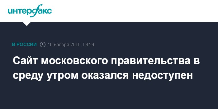Москва. 10 ноября. INTERFAX.RU – Официальный сервер правительства Москвы www.mos.ru в понедельник утром оказался временно недоступен. Официально причины сбоев в работе сайта пока неизвестны, однако сбой, наблюдающийся на сайте, может быть, в том числе, связан с перегрузкой запросами.