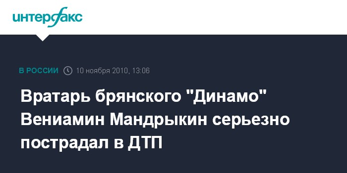 Брянск. 10 ноября. INTERFAX.RU - Вратарь футбольного клуба "Динамо" (Брянск) Вениамин Мандрыкин находится в реанимации после ДТП, которое произошло в Брянске в ночь со вторника на среду.