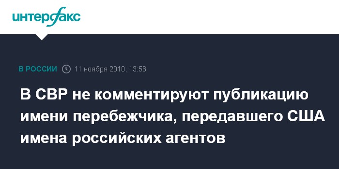 Москва. 11 ноября. INTERFAX.RU - В Службе внешней разведки (СВР) РФ отказались комментировать сообщение газеты "Коммерсант" о том, что виновником российско-американского шпионского скандала, разразившегося в июне 2010 года, стал полковник СВР РФ Щербаков, лично сдавший американским спецслужбам данные о российских агентах и сбежавший в США.