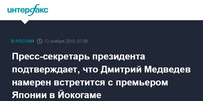 Пресс-секретарь президента подтверждает, что Дмитрий Медведев намерен встретится с премьером Японии в Йокогаме