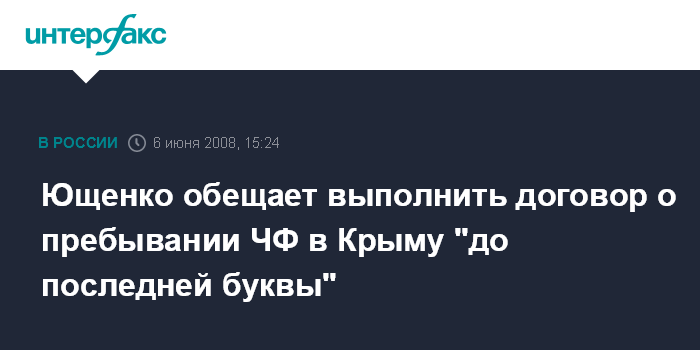"Договор о пребывании Черноморского флота в Севастополе, которые предполагает, что он находится там до 2017 г. - это договор, который до последней буквы будет выполнен украинской стороной", - сказал Ющенко в журналистам в Стрельне, комментируя встречу с президентом России Дмитрием Медведевым.