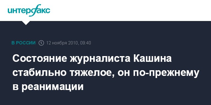 Как сообщил "Интерфаксу" источник в стационаре в пятницу утром, состояние Кашина оценивается как тяжелое, но стабильное, он по-прежнему находится в нейрохирургической реанимации.