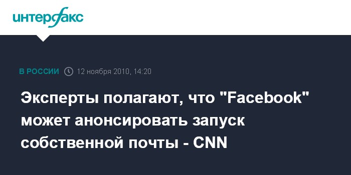 Москва. 12 ноября. INTERFAX.RU - Эксперт Пит Кэшмор в персональном блоге на сайте американского телеканала CNN высказал предположение, которое уже прозвучало в ряде СМИ, что планируемая конференция социальной сети "Facebook" может быть посвящена запуску новой почтовой системы. Представители компании на сегодняшний день не подтверждают слухи о собственной почте.