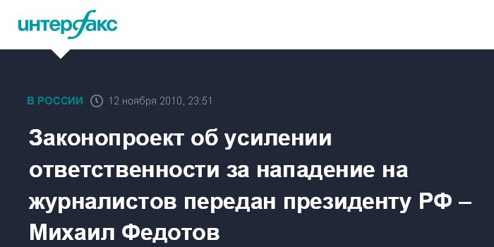 Ранее М.Федотов сообщал, что возглавляемый им Совет готовит поправки в УК РФ, которые предусматривают усиление ответственности за воспрепятствование законной деятельности журналиста, за посягательство на жизнь журналистов, правозащитников и других лиц, выполняющих общественный долг.