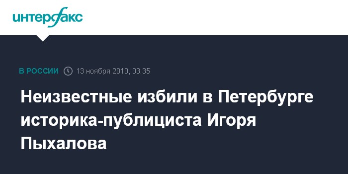 Санкт-Петербург. 13 ноября. ИНТЕРФАКС СЕВЕРО-ЗАПАД - В Петербурге избит известный историк и публицист Игорь Пыхалов, сообщает сайт фонда "Историческая память".