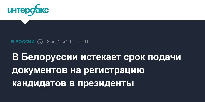 Минск. 13 ноября. ИНТЕРФАКС-ЗАПАД - Документы на регистрацию кандидатами в президенты Белоруссии должны быть поданы претендентами в Центризбирком до 13 ноября