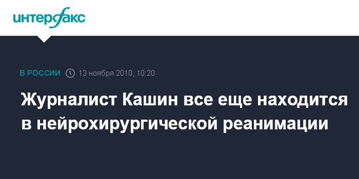 Москва. 13 ноября. INTERFAX.RU - Журналист "Коммерсанта" Олег Кашин, который был жестоко избит в ночь на 6 ноября, по-прежнему находится в реанимацииего состояние оценивается как тяжелое, сообщили "Интерфаксу" в 36-й клинической больнице.