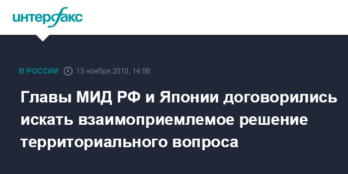 Заведующий информационным отделом посольства Японии в РФ Акира Имамура сообщил, что главы МИД Японии и России "изложили свои позиции по поводу недавнего посещения президентом РФ Дмитрием Медведевым острова Кунашир и на основе этого пришли к единому мнению о том, чтобы продвигать двусторонние отношения в спокойной обстановке, строя доверительные отношения между собой".
