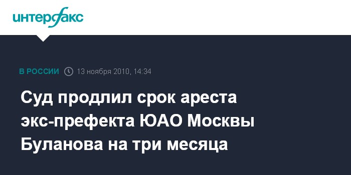 13 ноября. INTERFAX.RU - Тверской суд Москвы оставил под стражей бывшего префекта Южного административного округа Юрия Буланова и продлил срок ареста до 12 февраля 2011 года, сообщил корреспонденту "Интерфакса" адвокат Буланова Сергей Старовойтов.