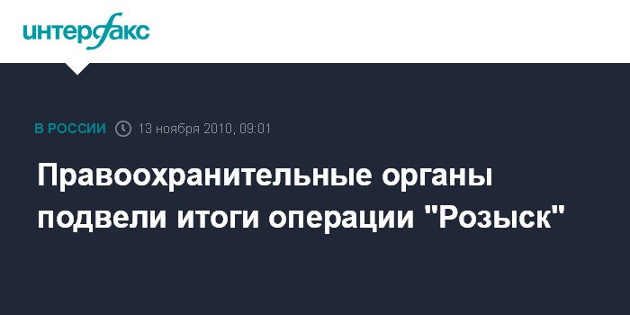 Москва. 13 ноября. INTERFAX.RU - Подведены итоги межгосударственной широкомасштабной комплексной оперативно-профилактической операции "Розыск", которая проводилась с 20 по 22 октября 2010 года органами внутренних дел МВД, ГУВД, УВД по субъектам РФ совместно с МВД (полицией) государств-участников СНГ, сообщили в пресс-службе департамента уголовного розыска МВД РФ.