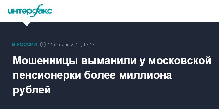 Москва. 14 ноября. INTERFAX.RU - Крупное мошенничество совершено на юго-востоке Москвы: в милицию пришла 90-летняя москвичка с заявлением, что ее ограбили на 1 млн рублей. Как выяснилось, днем в пятницу в квартиру женщины в Краснокурсантском проезде пришли две женщины. Они представились сотрудниками правительства Москвы и рассказали, что специально для пожилых пенсионеров, ветеранов войны и труда, власти разработали программу поддержки - в уполномоченном банке открывается счет, на который надо положить деньги под большой процент.