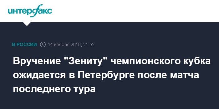 Вручение "Зениту" чемпионского кубка ожидается в Петербурге после матча последнего тура