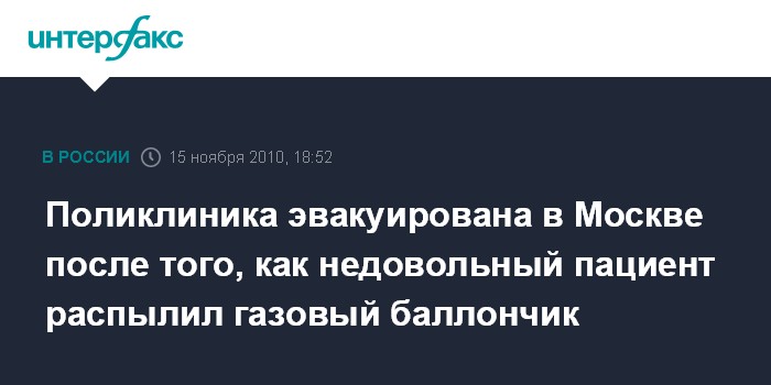 Москва. 15 ноября. INTERFAX.RU - Обиженный посетитель распылил газ из баллончика в поликлинике на западе Москвы недалеко от Кутузовского проспекта.