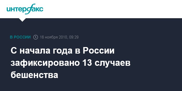 Москва. 16 ноября. INTERFAX.RU - За девять месяцев 2010 года на территории РФ зафиксировано 13 случаев заражения людей бешенством, сообщили "Интерфаксу" во вторник в московском управлении Роспотребнадзора.