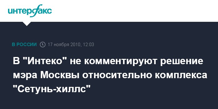Москва. 17 ноября. INTERFAX.RU - В компании "Интеко" не комментируют решение мэра Москвы Сергея Собянина об отмене проектирования и строительства на пересечении Староволынской и Минской улиц на западе столицы многофункционального комплекса "Сетунь-хиллс".