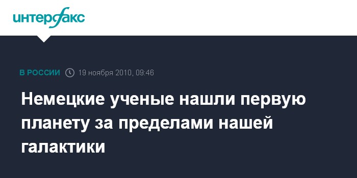 Лондон. 19 ноября. INTERFAX.RU - Немецкие астрономы из института имени Макса Планка заявляют, что им удалось обнаружить первую планету, находящуюся за пределами нашей галактики Млечный Путь, передает британская корпорация BBC.