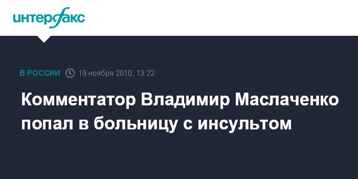 "По имеющейся информации, в ходе обследования у Владимира Никитича (Маслаченко - ИФ) был диагностирован тяжелый инсульт. Его состояние по-прежнему стабильно тяжелое. Все сотрудники НТВ-ПЛЮС желают ему скорейшего выздоровления и возвращения к любимой работе", - сообщает официальный сайт телеканала.