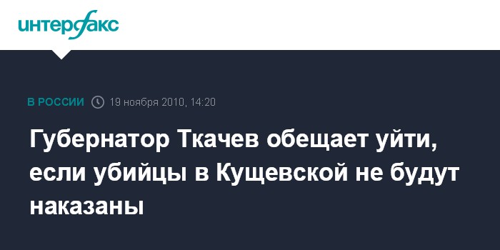 Краснодар. 19 ноября. INTERFAX.RU - Губернатор Краснодарского края Александр Ткачев пообещал уйти в отставку, если убийцы 12 человек в станице Кущевской сумеют избежать наказания.