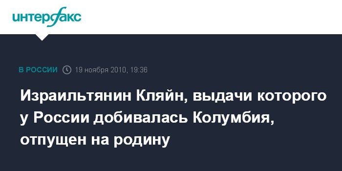 Москва. 19 ноября. ИНТЕРФАКС - Россия отпустила на родину израильтянина Яира Кляйна, который обвинялся властями Колумбии в подготовке боевиков наркомафии, сообщает источник.