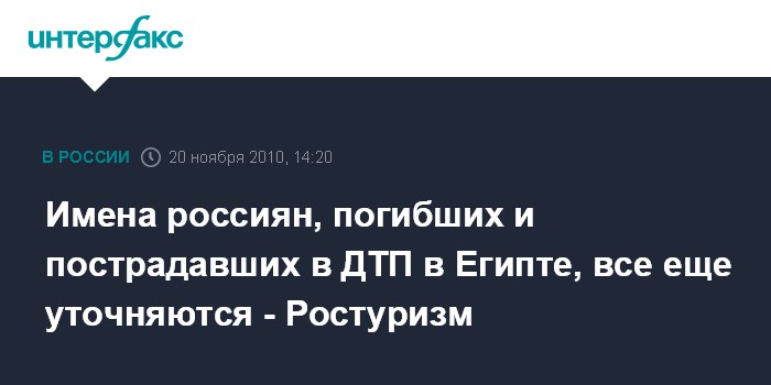 Москва. 20 ноября. INTERFAX.RU - Пока точной информации относительно числа погибших и пострадавших в ДТП в Египте российских туристов нет, сообщили порталу "Интерфакс-Туризм" в Минспорттуризма России и Ростуризме. По данным этих ведомств, пока идет работа по уточнению причин аварии, информации о туроператорах и страховых компаниях. По последним данным, погибло не восемь человек, а семь, однако вопрос о том, граждане какой страны, пока уточняется. Всего число пострадавших составило 40 человек.