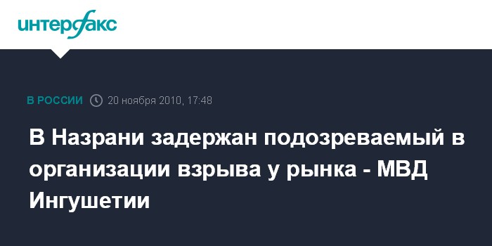 Назрань. 20 ноября. INTERFAX.RU - На окраине Назрани в ходе оперативно-розыскных мероприятий по "горячим следам" задержан подозреваемый в организации взрыва в винно-водочном магазине у центрального рынка в Назрани. Как сообщил агентству "Интерфакс-Юг" представитель пресс-службы МВД Ингушетии, подозреваемый был задержан на окраине Назрани, он передвигался на автомашине "Нива". "В настоящее время подозреваемый задержан, в отношении него проводятся следственные действия", - сказал представитель пресс-службы.