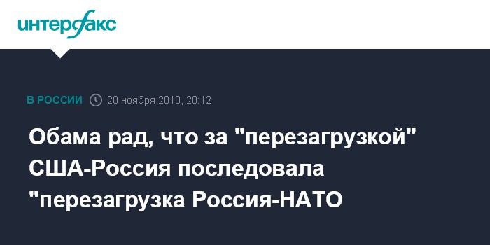 "Я очень рад, что мой друг и коллега президент Медведев присоединился к нам сегодня на саммите Россия-НАТО. Вместе мы тесно работали над перезагрузкой российско-американских отношений, что привело к конкретной пользе для обеих наших стран. Теперь мы также перезагружаем отношения России и НАТО", - сказал он на пресс-конференции по итогам саммита Россия-НАТО в Лиссабоне.