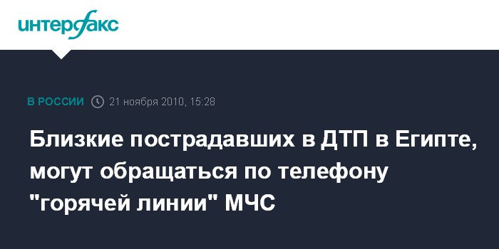 Москва. 21 ноября. INTERFAX.RU - МЧС России открыло "горячую линию" для родственников пострадавших в результате ДТП в Египте. "Центр экстренной психологической помощи (ЦЭПП) МЧС России открыл "горячую линию" для оказания психологической помощи родственникам пострадавших в результате ДТП в Египте россиян", - сообщили "Интерфаксу" в пресс-службе ЦЭПП МЧС в воскресенье. В пресс-службе отметили, что по телефону (495-626-37-07) можно получить всю информацию о пострадавших в Египте россиянах.