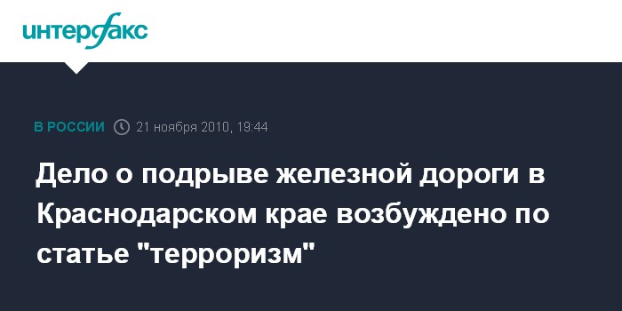 Дело о подрыве железной дороги в Краснодарском крае возбуждено по статье "терроризм"