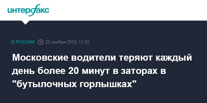 Согласно исследованию аналитического центра "Яндекс.Пробки", всего в городе насчитывается порядка 30 "бутылочных горлышек", у водителя в среднем уходит 25-35 минут на преодоление заторов. Вычислили эксперты и "лидеров" рейтинга подобных заторов. "Самое неприятное "бутылочное горлышко" в утренний час пик – это пересечение Волгоградского проспекта и Люблинской улицы – средняя скорость движения перед перекрестком составляет около 3 км/ч, а после него – примерно 20 км/ч. Каждый водитель теряет здесь 32 минуты – это разница между временем, которое ушло бы на этот участок, если постоянно ехать со скоростью 20 км/ч, и реальным временем", - сообщается в поступившем в "Интерфакс" исследовании "Яндекса". Для вечернего же времени, как указывают специалисты, самым сложным участком является Ленинградское шоссе перед МКАД. Здесь временные потери оцениваются в полчаса.