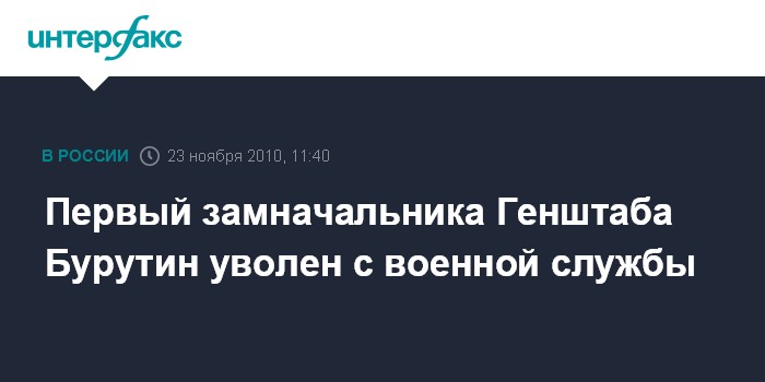 Москва. 23 ноября. INTERFAX.RU - Президент РФ Дмитрий Медведев уволил с военной службы первого замначальника Генштаба Вооруженных сил генерал-лейтенанта Александра Бурутина.