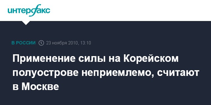 Москва. 23 ноября. INTERFAX.RU - Россия считает неприемлемым применение силы на Корейском полуострове и призывает стороны проявить сдержанность, заявил высокопоставленный дипломатический источник, комментируя ситуацию на Корейском полуострове.