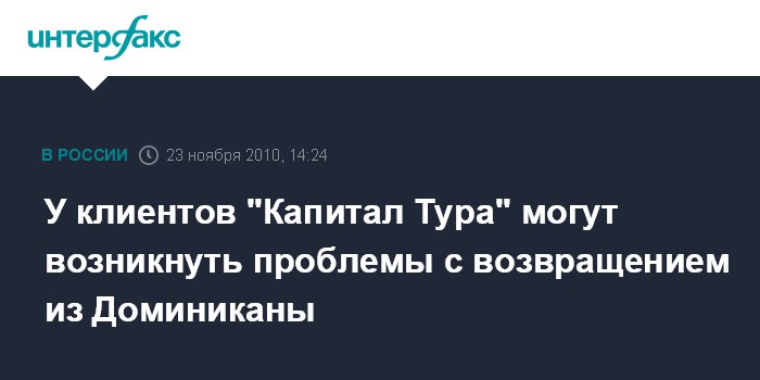 Москва. 23 ноября. INTERFAX.RU - У 68 российских туристов, клиентов компании "Капитал Тур", отдыхающих в настоящее время в Доминиканской Республике, 24 ноября могут возникнуть проблемы с возвращением на родину, сообщил "Интерфаксу" заместитель руководителя Ростуризма Евгений Писаревский.