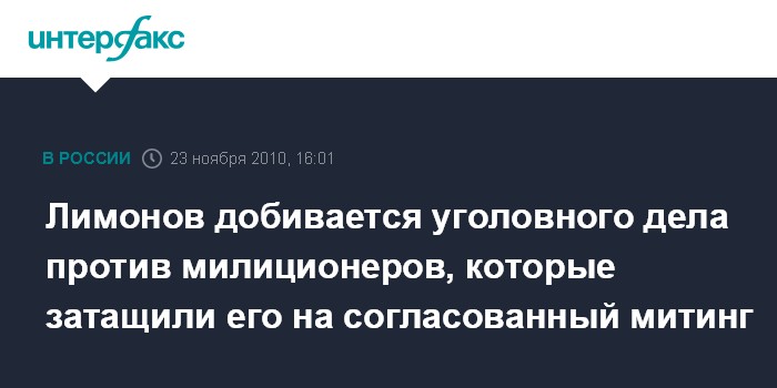 "Лимонов направил в Генеральную Прокуратуру заявление с требованием возбудить уголовное дело против милиционеров, затащивших его на согласованный митинг на Триумфальной площади 31 октября", - сообщил "Интерфаксу" член исполкома коалиции "Другая Россия" Александр Аверин.