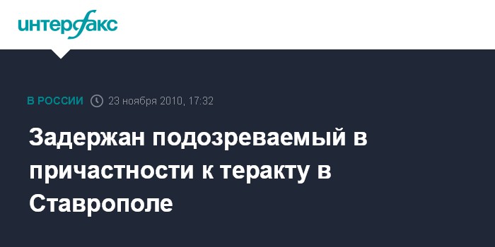 Как сообщил официальный представитель СК РФ Владимир Маркин "Интерфаксу" во вторник, следственным управлением СКП РФ по Ставропольскому краю задержан уроженец Дагестана. Следствием проверяется его причастность к организации и совершению террористического акта 26 мая 2010 года в центре Ставрополя, в результате которого погибли восемь человек, в том числе 12-летняя девочка, более 50 человек были ранены.
