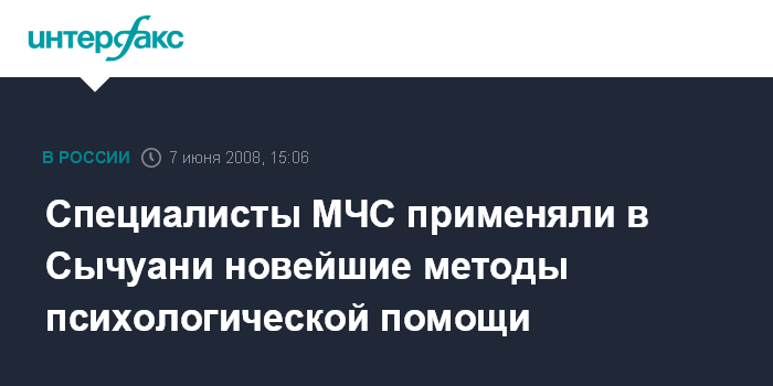 Москва. 7 июня. INTERFAX.RU - Психологи МЧС России при работе с пострадавшими от землетрясения в Китае применяли новейшие методы психологической помощи.