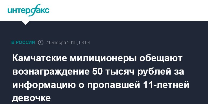 Петропавловск-Камчатский. 24 ноября. ИНТЕРФАКС-ДАЛЬНИЙ ВОСТОК - За оперативно значимую информацию, которая поможет установить местонахождение Ольги Беспрозванной или установить обстоятельства её исчезновения, УВД по Камчатскому краю объявлено вознаграждение в сумме 50 тысяч рублей, сообщает в среду пресс-служба краевого УВД.
