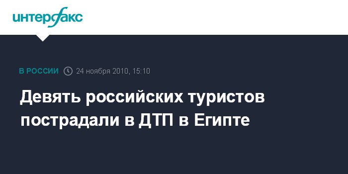 Москва. 24 ноября. INTERFAX.RU - В результате ДТП автобуса в Египте с российскими туристами девять человек, по предварительной информации, получили легкие ранения, сообщили "Интерфаксу" в Ассоциации туроператоров России (АТОР).