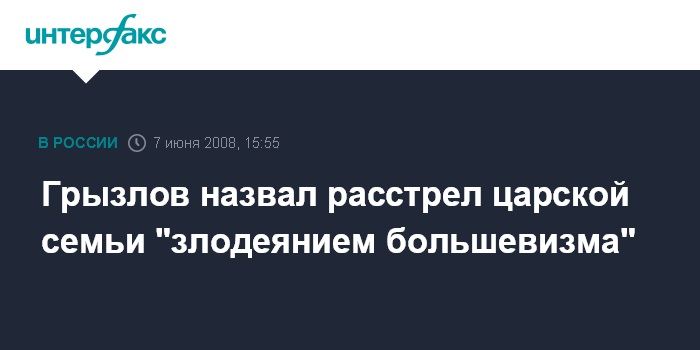 Санкт-Петербург. 7 июня. INTERFAX.RU - Спикер Госдумы, председатель Высшего совета партии "Единая Россия" Борис Грызлов назвал расстрел Николая II и всей царской семьи "злодеянием большевизма".