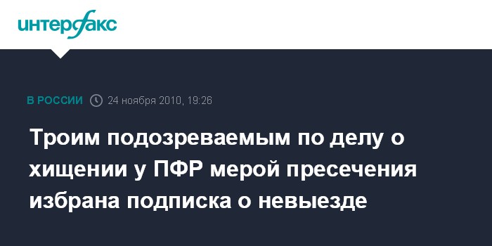 Москва. 24 ноября. INTERFAX.RU - Трое подозреваемых по делу о хищении 1,2 млрд руб., принадлежащих Пенсионному фонду России (ПФР), отпущены под подписку о невыезде, сообщили в Следственном комитете при МВД России.
