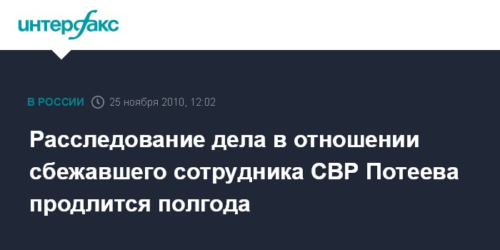 По его словам, уголовное дело в отношении полковника СВР Потеева заведено по статье 275 УК РФ (государственная измена) и, "судя по опыту, оно будет завершено не раньше мая 2011 года".