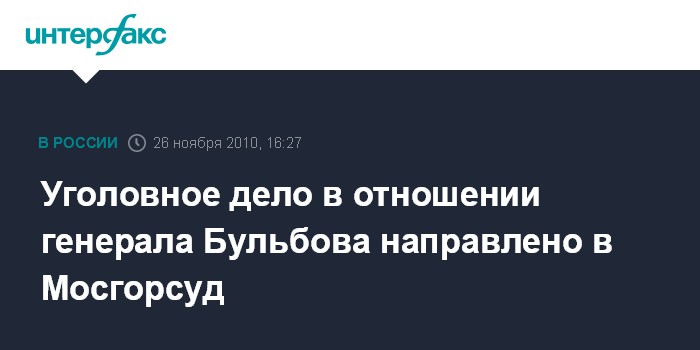 "Заместитель генпрокурора РФ Виктор Гринь направил в Мосгорсуд уголовное дело в отношении Бульбова", - сообщила "Интерфаксу" в пятницу официальный представитель генпрокуратуры РФ Марина Гриднева.