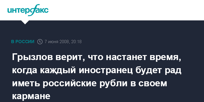 "Разговоры о том, что рубль может быть резервной национальной валютой, абсолютно оправданы. Это абсолютно реальная идея, имеющая под собой экономический фундамент", - сказал Б.Грызлов журналистам в ходе XXII Петербургского международного экономического форума.