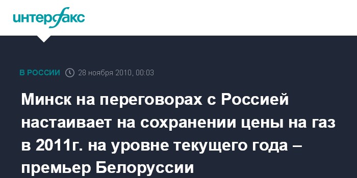 "С 1 января 2011 года газ для нашей страны должен идти по формуле с коэффициентом "1". Безусловно, в переговорах с РФ, на моих последних встречах с председателем правительства Владимиром Путиным, мы отстаивали позицию, чтобы в 2011 году для Белоруссии были максимально сохранены цены 2010 года", - сказал С.Сидорский.