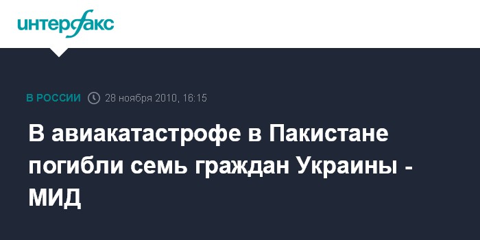 Киев. 28 ноября. INTERFAX.RU - Министерство иностранных дел Украины подтверждает гибель семерых граждан Украины - членов экипажа разбившегося в Пакистане самолета Ил-76. "Среди погибших - командир, пилот, штурман, два авиатехника, бортинженер и бортрадист", - сообщил агентству "Интерфакс-Украина" пресс-секретарь МИД Украины Александр Дикусаров. По его словам, эту информацию украинским дипломатам подтвердили в грузинской авиакомпании "Санвэй". Украинские дипломаты в Пакистане уже выяснили имена погибших. В ближайшее время представители МИД свяжутся с их родственниками.