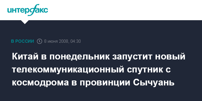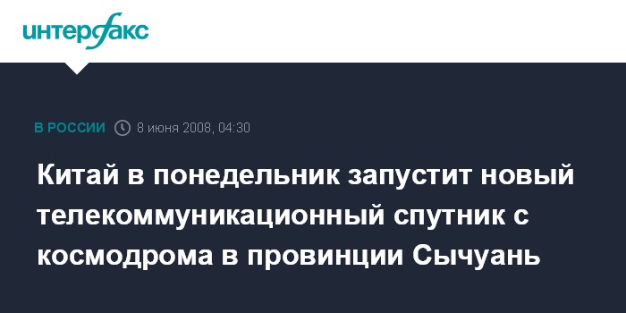 Пекин. 8 июня. ИНТЕРФАС-КИТАЙ - В понедельник, 9 июня, Китай панирует вывести на орбиту новый телекоммуникационный спутник "Чжунсин-9", сообщили местные СМИ со ссылкой на заявление "ответственного сотрудника космодрома".