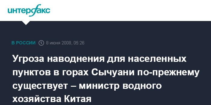 Пекин. 8 июня. ИНТЕРФАКС-КИТАЙ - В китайской провинции Сычуань продолжается сброс воды из подпорного озера в горах Танцзяшань, которое образовалось из-за землетрясения 12 мая, однако угроза наводнения существует, сообщил министр водного хозяйства Китая Чэнь Лэй.