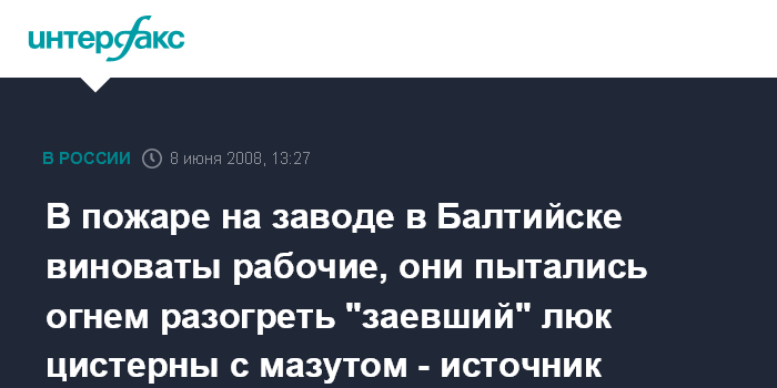 Калининград. 8 июня. ИHТЕРФАКС СЕВЕРО-ЗАПАД - Взрыв и пожар в доке судоремонтного завода в Балтийске произошли из-за того, что рабочие с нарушением техники безопасности пытались открыть крышку емкости с мазутом, сообщил "Интерфаксу" в воскресенье источник в администрации завода.