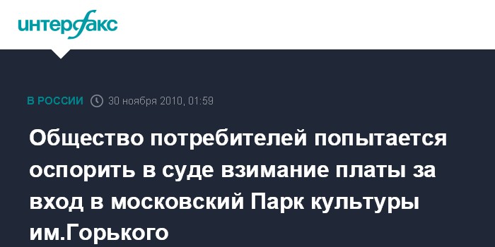 Москва. 30 ноября. ИНТЕРФАКС - Замоскворецкий суд Москвы во вторник вновь попытается начать рассмотрение по существу иска Общества защиты прав потребителей (ОЗПП) с требованием признать незаконным сбор платы за проход на территорию парка имени Горького.