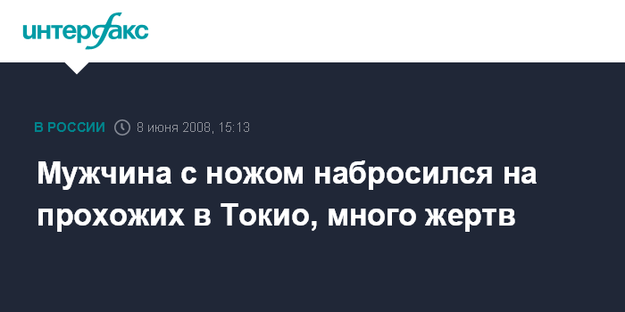 Токио. 8 июня. ИНТЕРФАКС - Вооруженный ножом мужчина убил семерых прохожих и ранил еще 11 в столице Японии, Токио, сообщает в воскресенье местное телевидение.